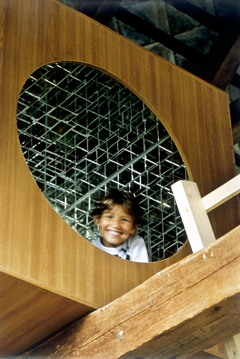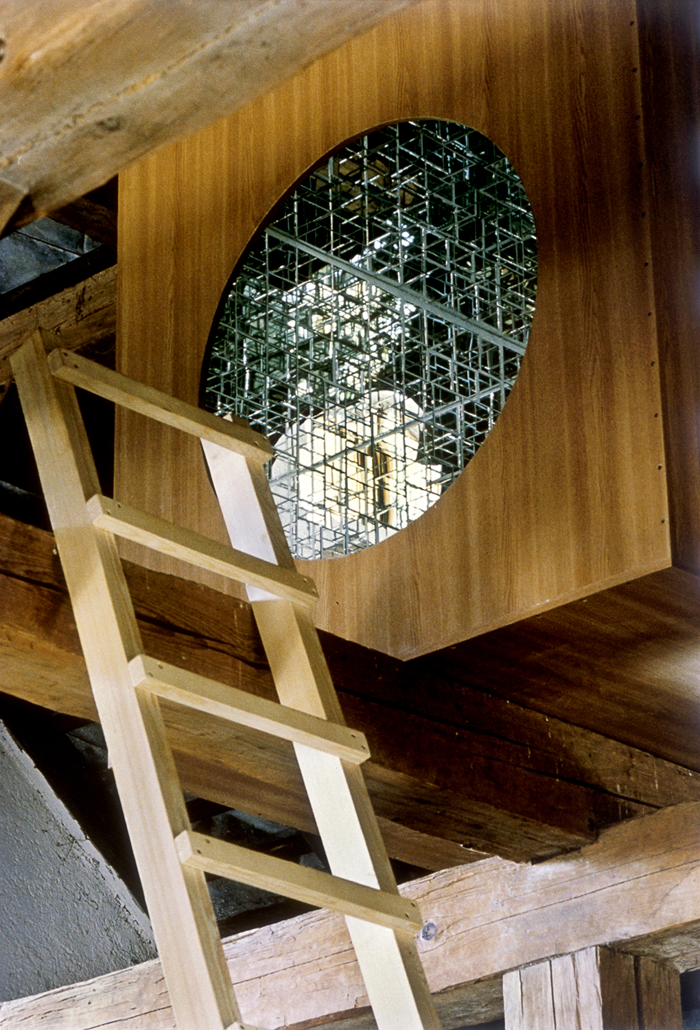 Love Lounge 2_ 2,5 Cubicmeter Infinitywalkable mirrored cube, 140 x 140 x 140cm Ladder 350cm, advertisement poster with collaged song title, Let`s get Lost Hotel Pupik AIR, Schwarzenberg`sche Meierei, Schrattenberg, Scheifling, A, 2003