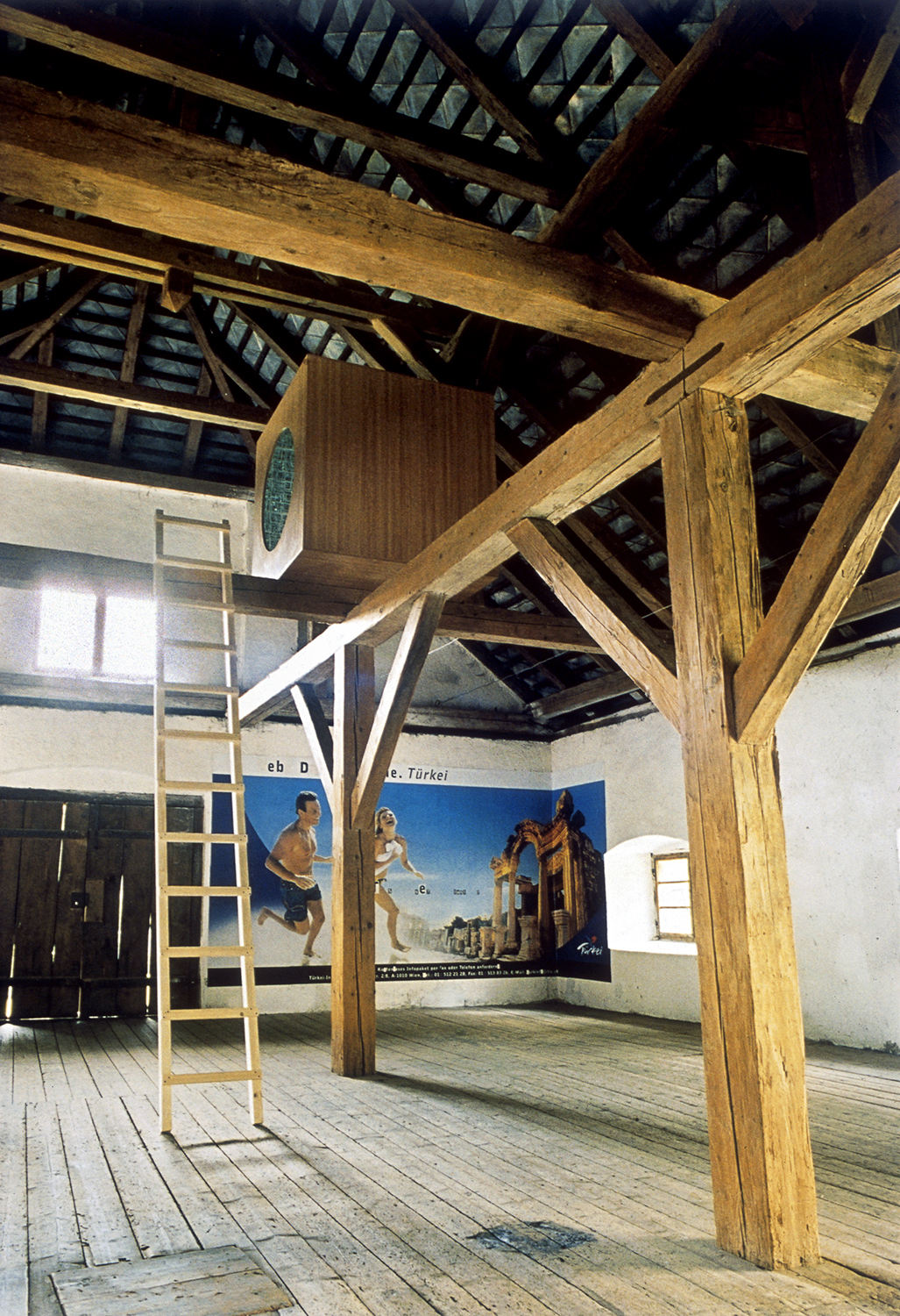 Love Lounge 2_ 2,5 Cubicmeter Infinitywalkable mirrored cube, 140 x 140 x 140cm Ladder 350cm, advertisement poster with collaged song title, Let`s get Lost Hotel Pupik AIR, Schwarzenberg`sche Meierei, Schrattenberg, Scheifling, A, 2003